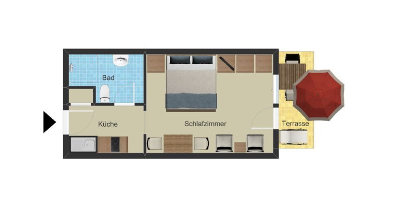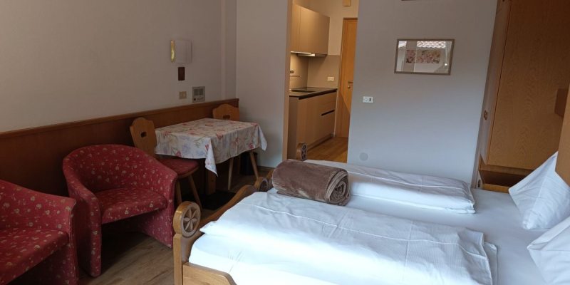 APPARTAMENTO "C" soggiorno con letto matrimoniale, angolo riposo, scrivania, TV, cucina con zona pranzo, bagno con doccia, WC, bidè e fon, balcone, posto macchina in garage gratuito.